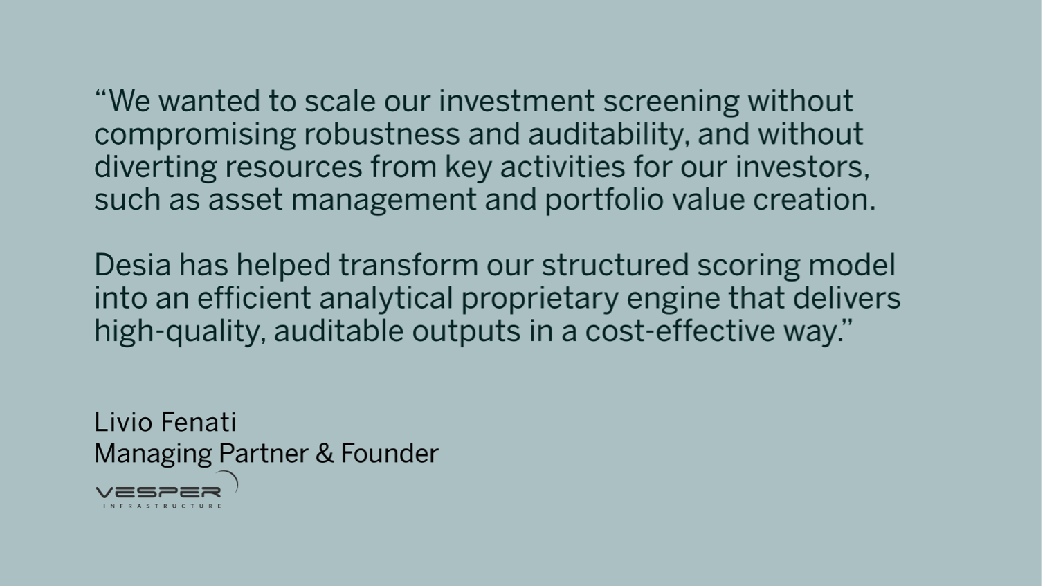 For Desia, this reflects our approachto building specialized tools that capture how expert teams think. We look forward to developing additional workflows as Vesper continues to scale its investment strategy across Europe.